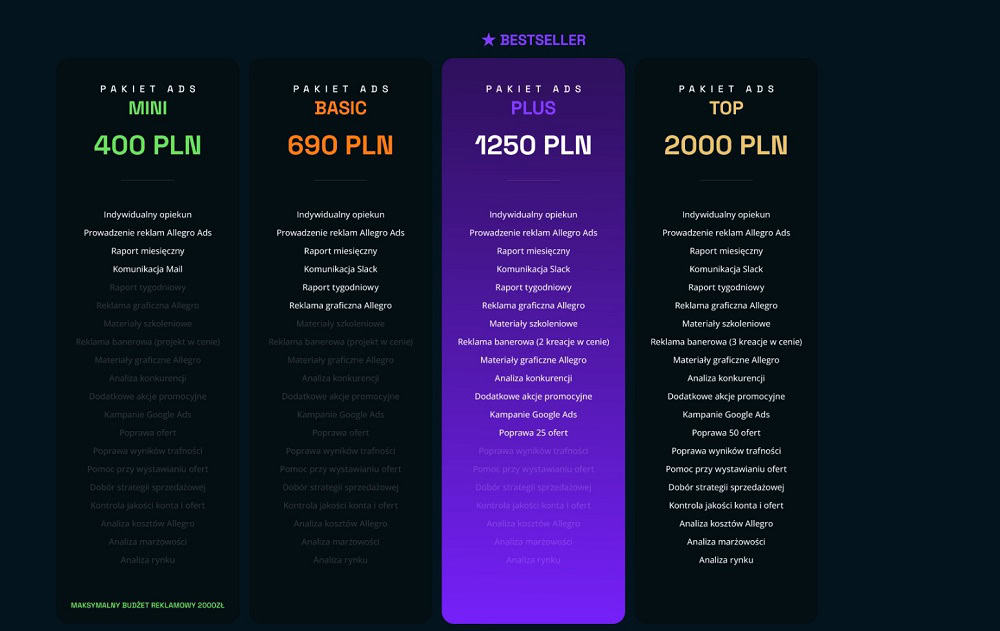 - 30 dni prowadzenia kampanii Allegro Ads bez opłat – pełne wdrożenie i obsługa reklam przez doświadczony zespół, dzięki czemu sprzedawca może zobaczyć realne efekty jeszcze przed podjęciem decyzji o dłuższej współpracy.
